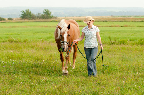 - Prowadź konia z lewej strony, trzymając uwiąz blisko kantara.