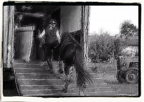 Dziewczynki były bardzo ciekawe, jak konie dostaną się do tego wielkiego samochodu, tym bardziej, że nie było żadnych drzwi ani schodów. Drzwi na szczęście nie były potrzebne. Okazało się, że część ściany (tej, na której namalowany był koń) otwiera się, tworząc pochylnię aż do ziemi. Po tej pochylni konie wchodziły do auta jeden za drugim, mimo że było bardzo stromo. Między końmi pan Grzesiu zakładał specjalne ścianki, więc każdy koń jechał sobie w osobnej przegrodzie.