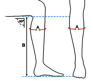 A - obwód łydki mierzymy w najszerszym miejscu dość ciasno, aby czapsy ciasno przylegały. Zbyt szerokie czapsy zaczną nam się zwijać, a materiał z którego są wykonane szybko ulegnie zniszczeniu.