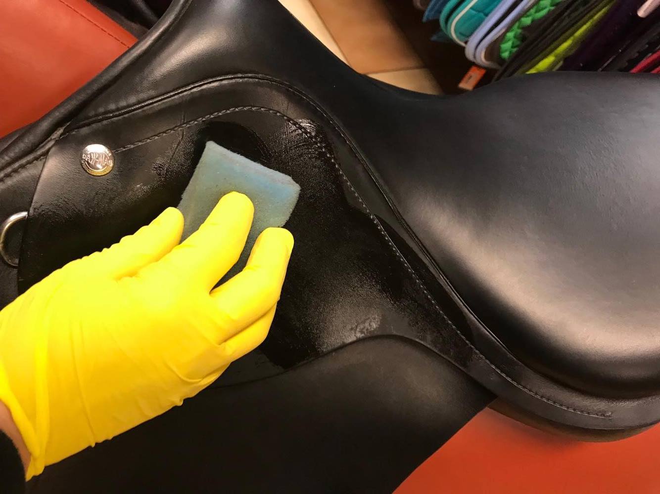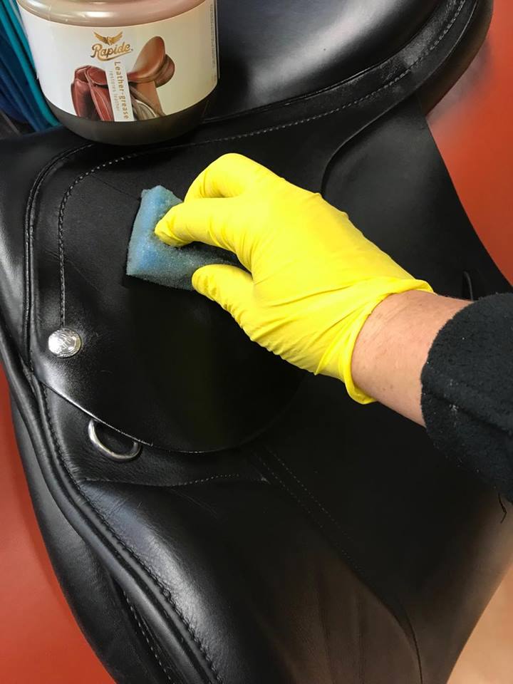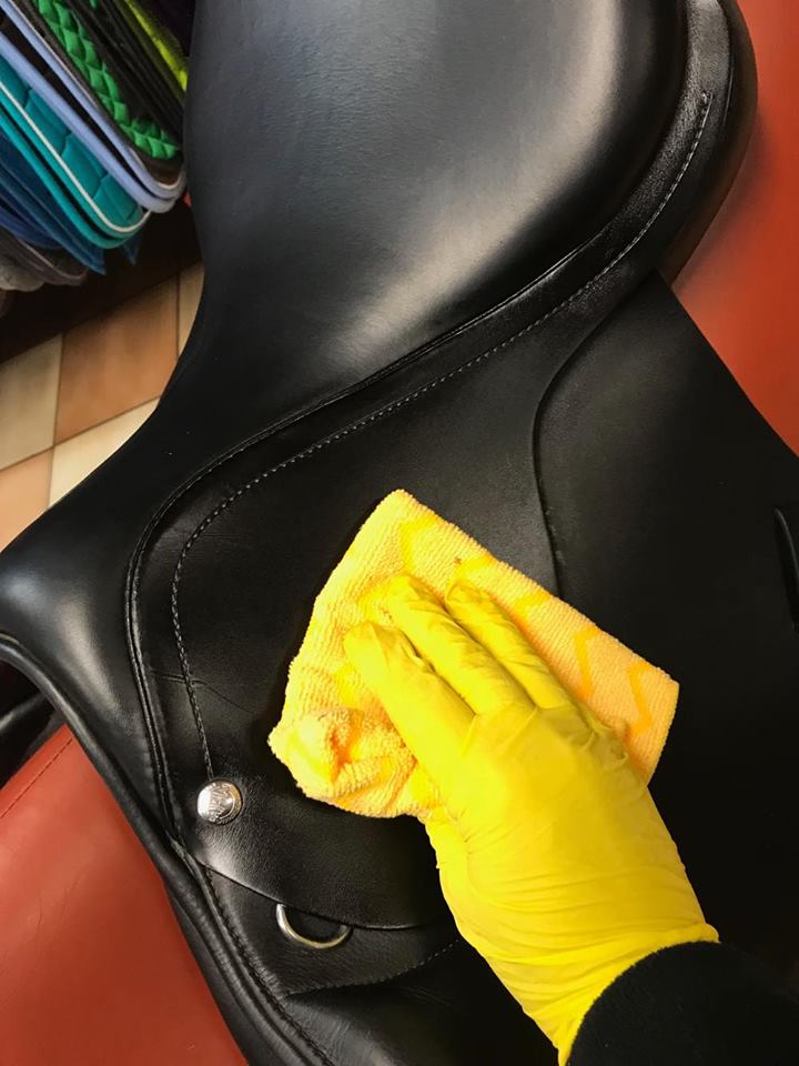 - Sprzęt jeździecki najlepiej po każdym użyciu przetrzeć, a szczególnie elementy ubrudzone błotem, piaskiem lub mające kontakt z końską skórą, a siodła przede wszystkim tam, gdzie dochodzi do tarcia mogącego uszkodzić powierzchnię, na tybinkach pod puśliskami, na przystułach, na podtybinkach.